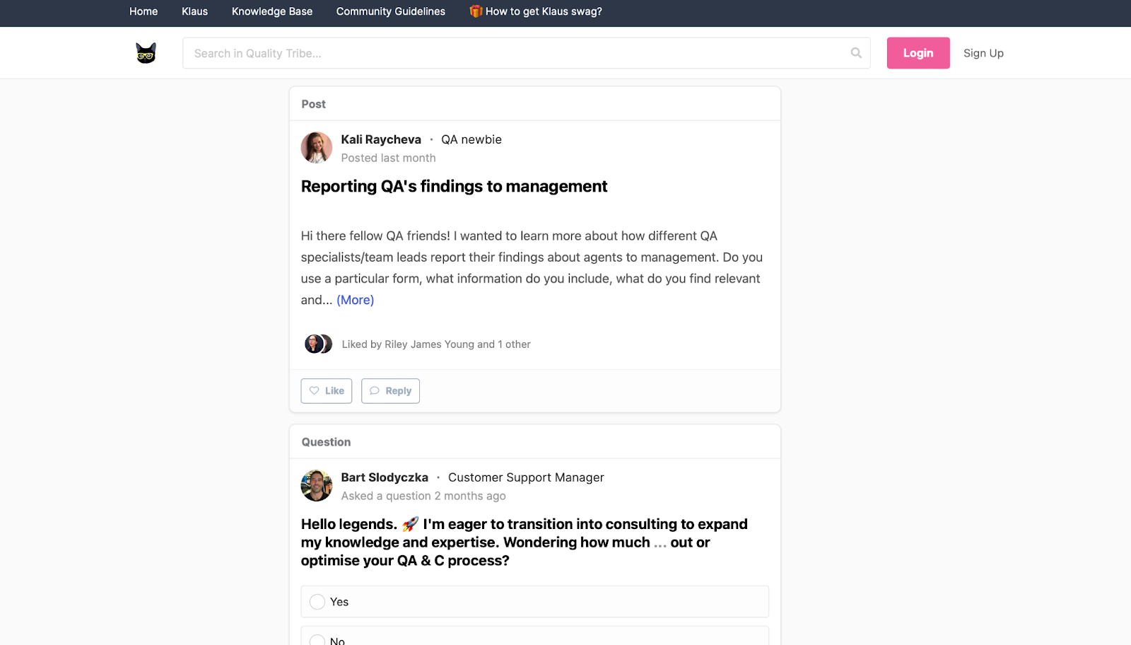 The community is run by Klaus, a customer support quality assurance tool. But it’s open to anyone, whether they are a customer or not. Klaus team members are active in the community and are happy to share their expertise.
