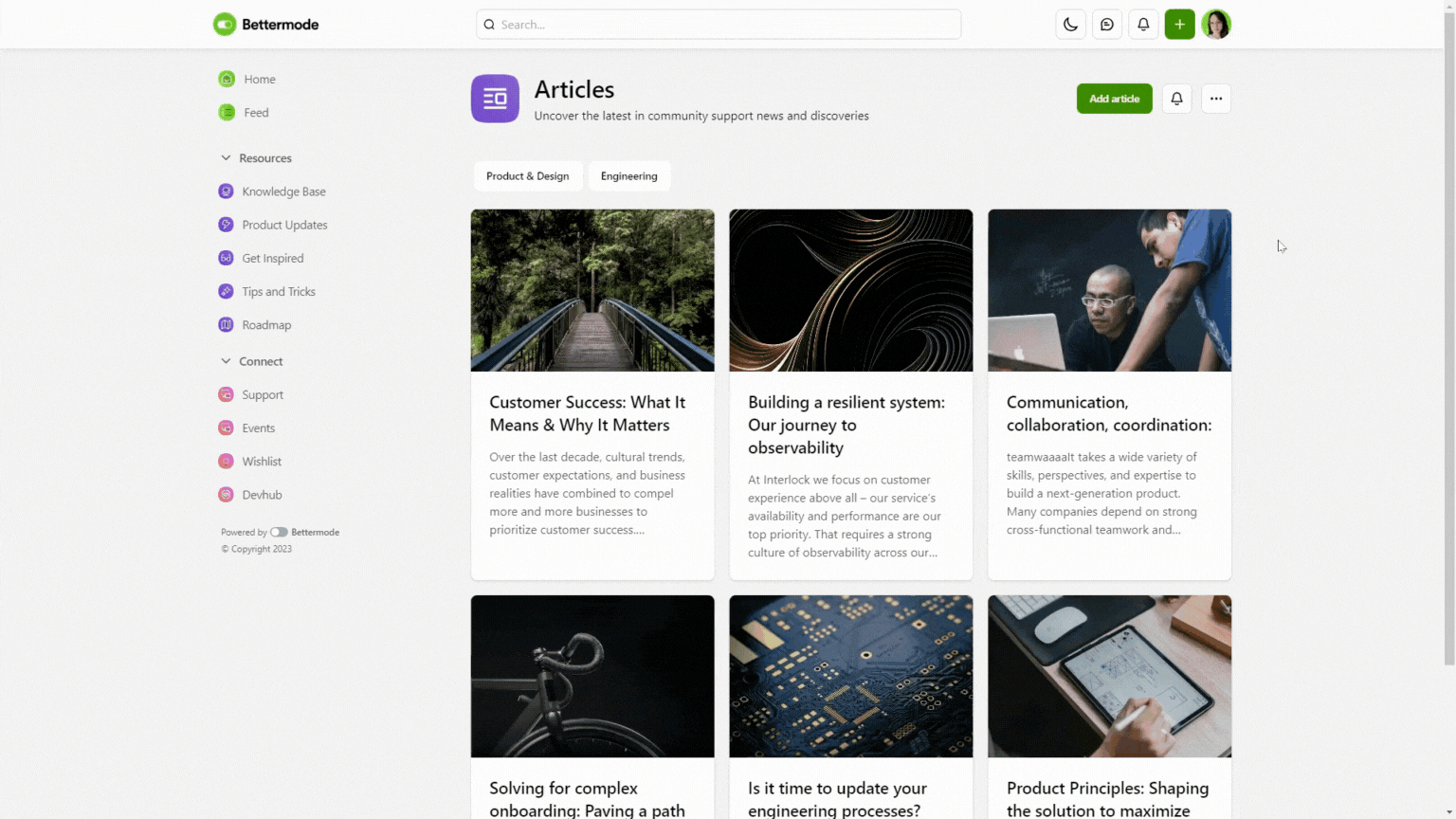 The articles space template promotes your articles in a gallery view, so you can entice your members into reading by displaying an eye-capturing image, a clever title, and a truncated article text to pique their interest! Articles allow for long-form written exploration of ideas, and you have 50,000 characters to explore your ideas in full!