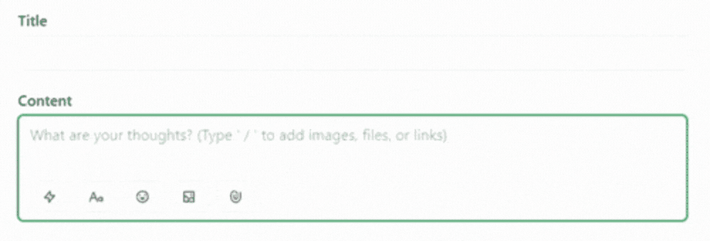 In the contents field, you can add text, images, videos, audio, and attachments. You can do this by using the toolbar icons below the content composer or by using slash commands in the content section itself. Here are some of the most popular slash commands that you and your members may like to know about: