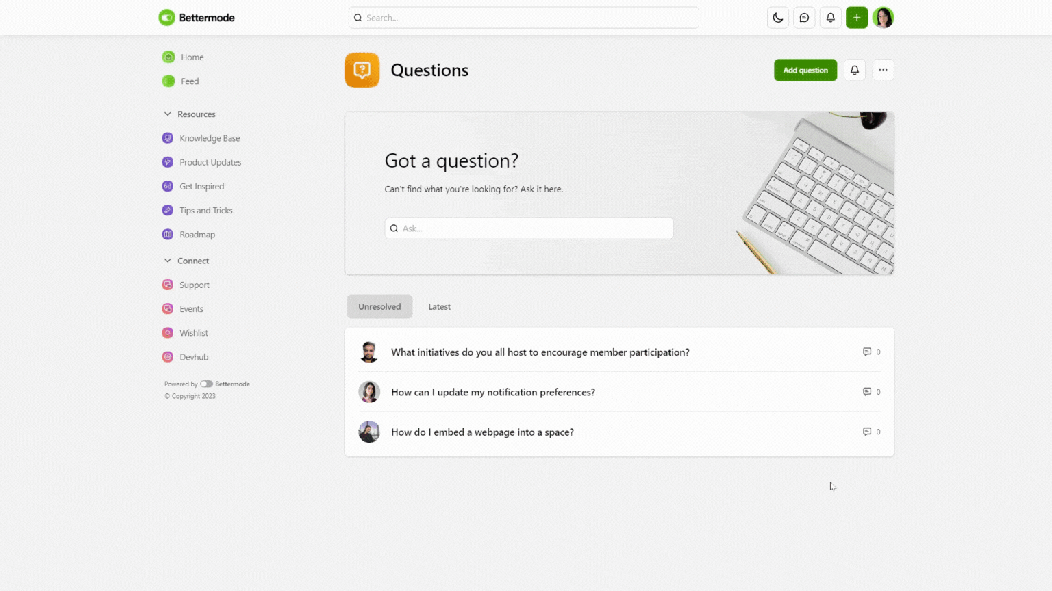 The question post type allows members to share their questions with the community by adding a title and description to their posts. Community admins and moderators can assign each question to community staff and also mark a question as resolved from the "edit post" section.